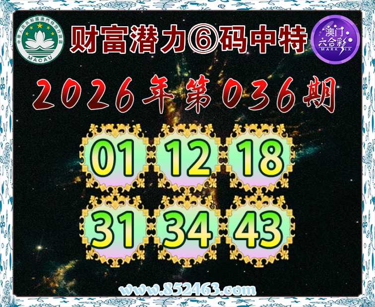 036期:『财富潜力』 🏃‍♀️⑥码中特🏃‍♀️【01.12.18.31.34.43】开:00准